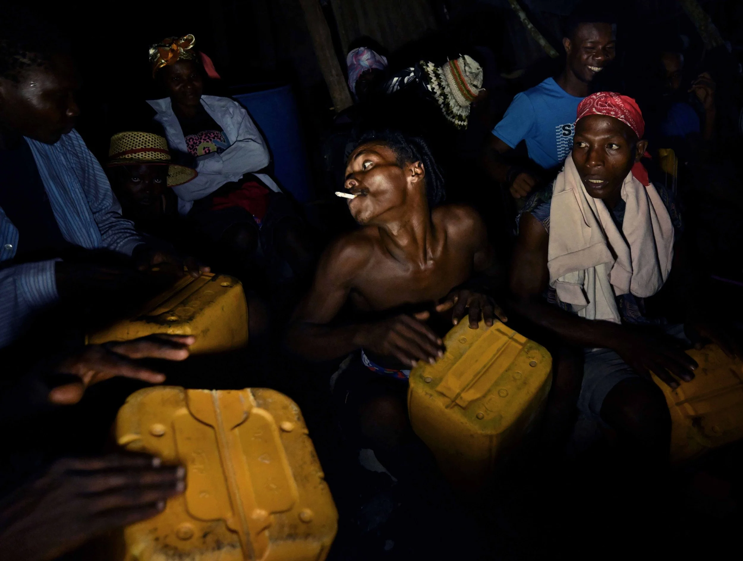 Dancing on rubble. Fanel Joseph plays drum on a plastic container during a village wake for Marie Herese Atineus who died in her sleep when part of her home collapsed during the massive earthquake in Maniche, Haiti on August 21, 2021.